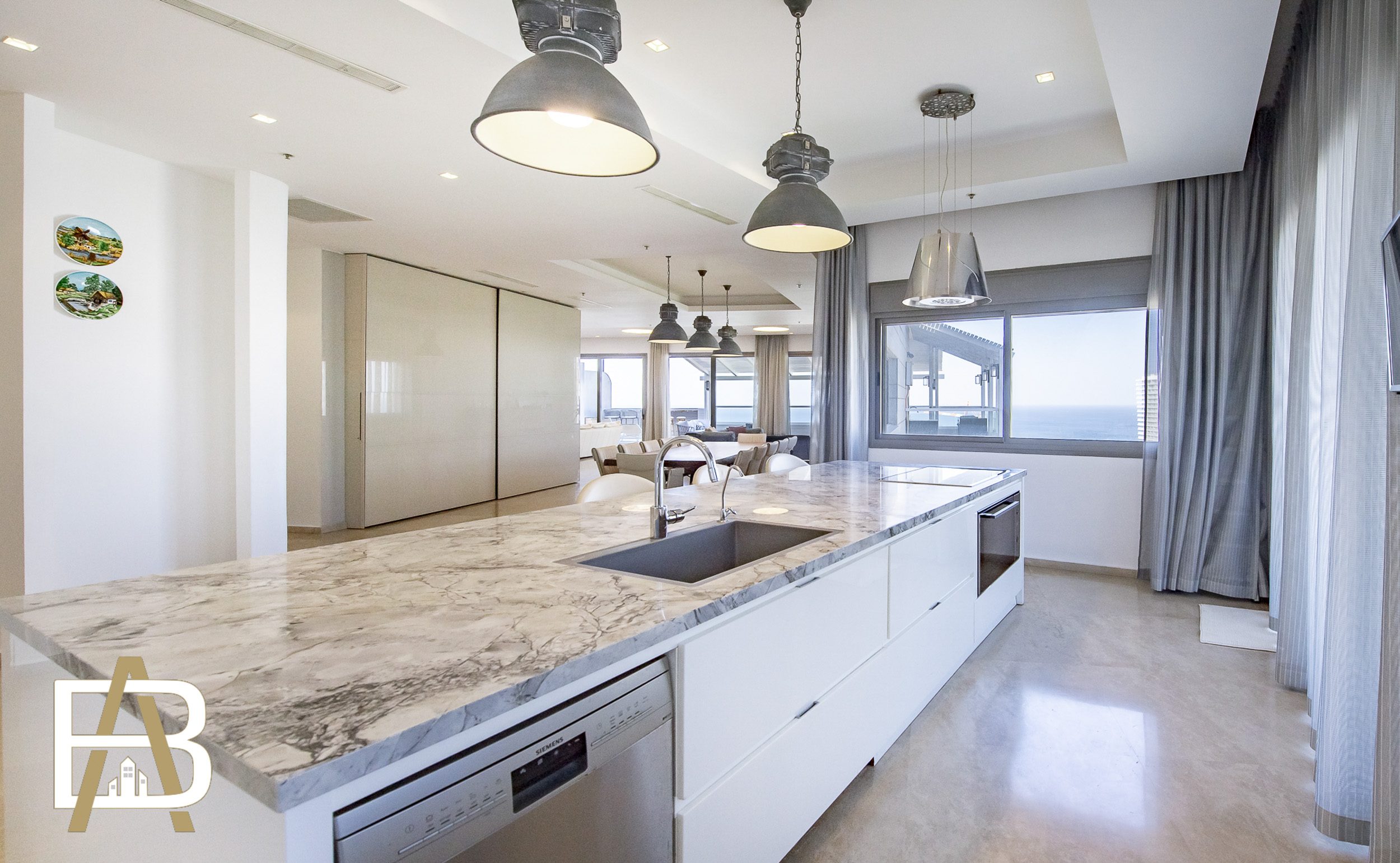 סלון מרשים, מטבח מודרני, מרפסות ענקיות עם נוף פתוח לים.